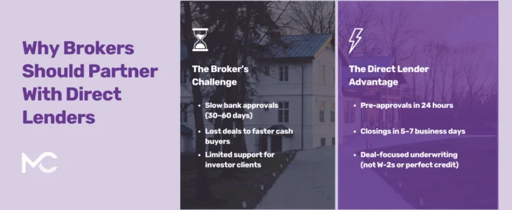 What your client brings to the table will determine whether their offer even gets considered. A pre-approval from a slow, traditional bank isn’t enough anymore. What closes deals is confidence and speed. That’s where direct lenders come in.